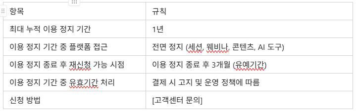 이용 정지 기간 중에는 라이브 세션, 웨비나, 디지털 콘텐츠 및 AI 도구를 포함한 모든 플랫폼 이용이 정지됩니다.